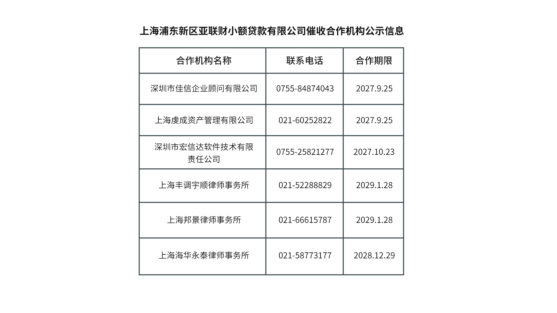 上海浦东新区亚联财小额贷款有限公司关于催收合作机构名单的公告