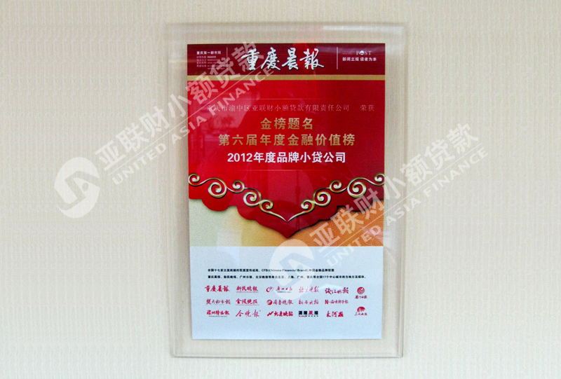 由CFB中国金融品牌主流媒体宣传联盟与重庆晨报共同办的“金榜题名——2012第六届年度金融价值榜”已于近日揭晓,本届参评金融价值榜的机构超过80家,主办方从企业形象、品牌服务、金融产品三方面对各家机构进行综合评测。重庆亚联财小额贷款成功上榜,获颁“2012年度品牌小贷公司”奖项。
